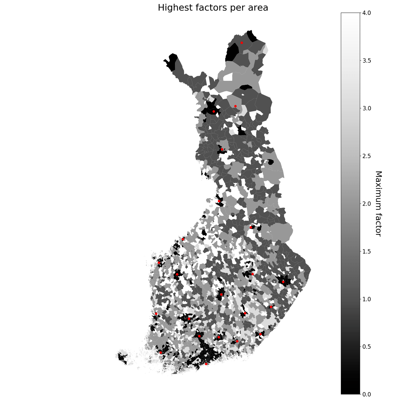 Highest factor for each postcode area, showing that the separation of cities and countryside works. Major cities are marked with a red dot.