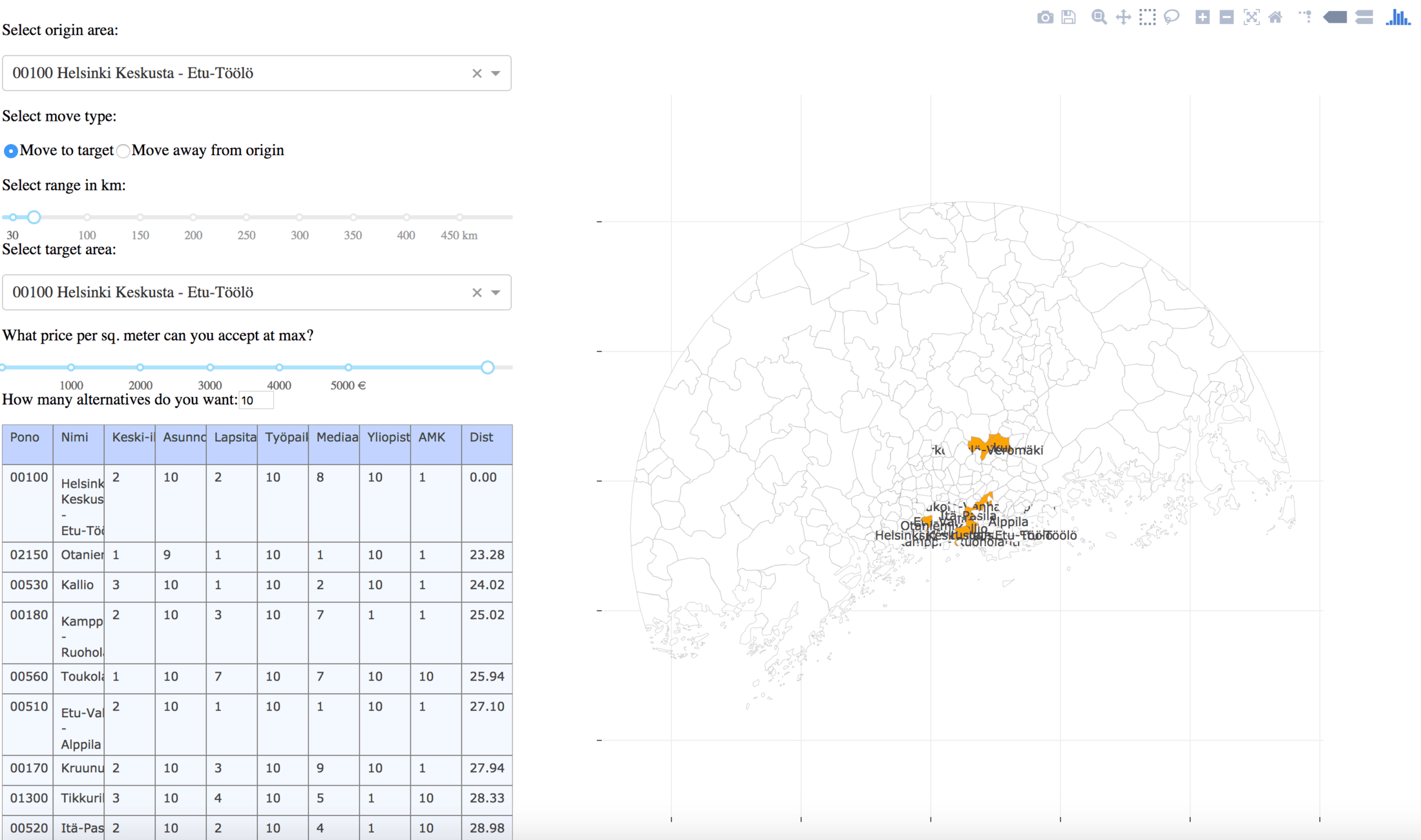 First, let me provide a quick example of what my prototype was meant to do. The use case I set out to solve was pretty simple: Let’s say you’re moving from one area in Finland to another. You like the area you currently live in, but don’t know much about the place you’re heading to. For example, you currently live in Kallio, the hipster-friendly neighborhood of Helsinki that features lots of cafés and young professionals, and you’re looking to move to Jyväskylä. Which neighborhood would you feel most at home in? Where is the Kallio of Jyväskylä? If you haven’t spent much time in Jyväskylä, you probably have no idea.