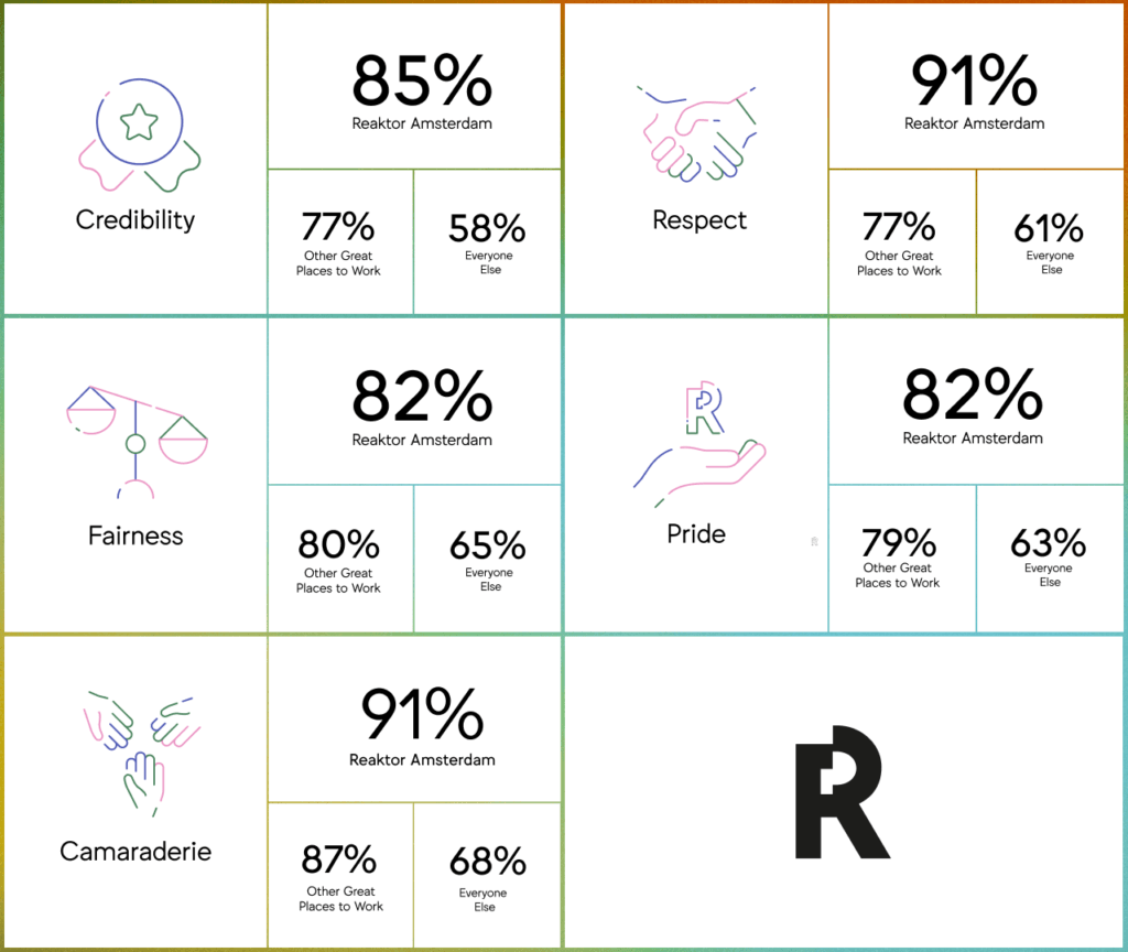 Back in June, a survey was sent to all the staff at Reaktor Amsterdam. They were asked to answer 60 questions that covered all sorts of topics, from pay to diversity to professional development. The results determined if we met the standard for a Great Place to Work. And it turns out we did—by a long shot!