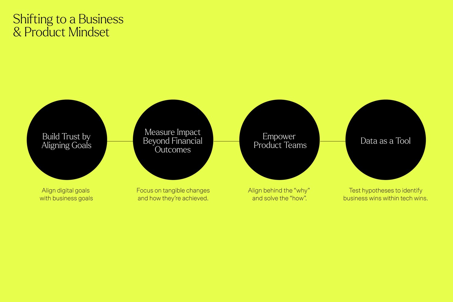 So, what’s a forward-thinking digital leader to do? While it can be easier to blame business leadership for not understanding the value of digital, we think it's more important to focus on what is within digital leadership and teams’ power to control. We asked leaders from disciplines across product, design, and engineering, and we received answers and ideas as varied as their roles. When we laid out all of the insights we gathered, a common thread seemed to be that the answer lies in shifting the way we think of ourselves - from feature delivery teams, to value creation teams.
