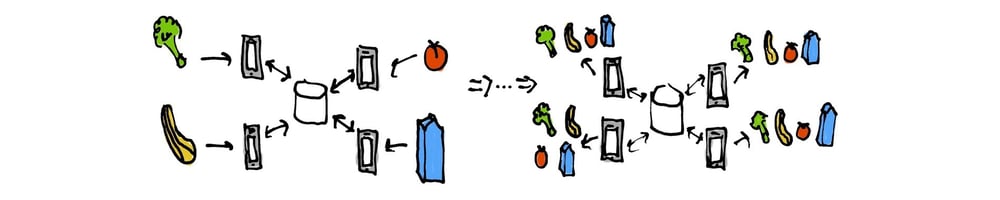 This app isn’t very useful if it only sends one broccoli from one person to another. What if I throw in tomatoes and my wife throws in milk and our friends who are visiting want zucchini and butternut squash?