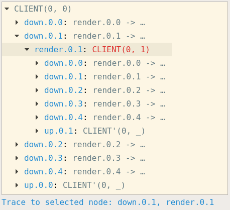 Now, we want to show that a change on client 0 will make it to client 1. What does this look like from the outside i.e. what sequence of events would we expect to see if this works? We would expect to see an input/upload event from client 0 followed by a render event from client 1: <up.0.0, render.1.1>. In between a bunch of other events happen that we don’t care about right now.