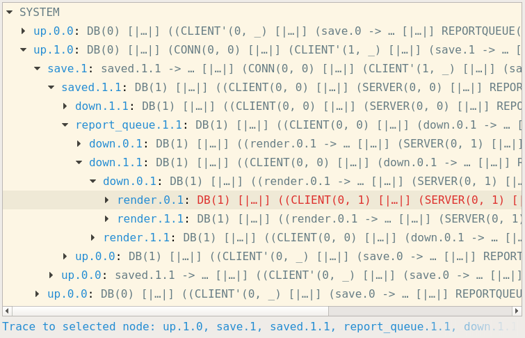 The database process DB is very simple. It takes a new state to save from the server sync process i and saves it, returning the id t representing the database after being saved. The report queue process REPORTQUEUE takes these saved events and puts them in a sliding buffer of size 1 for other server sync processes to consume. This is how changes are passed from one client to another. It is a sliding buffer of size 1 because we only care about the latest state of the database. If we don’t have time to process an event in between it doesn’t matter – we just diff with the latest state we have available and send that down to the client.