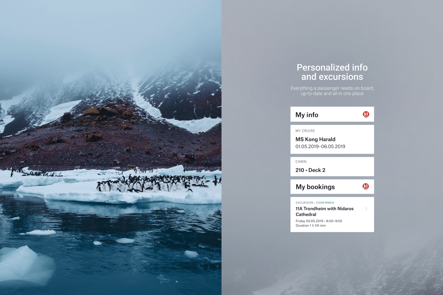 Thanks to the app we built, passengers on the MS Roald Amundsen can get all the personalized info they need while on board from one place – including the excursion catalog, their booked excursions, and the daily program – safe in the knowledge that the information is always close at hand and up to date.
