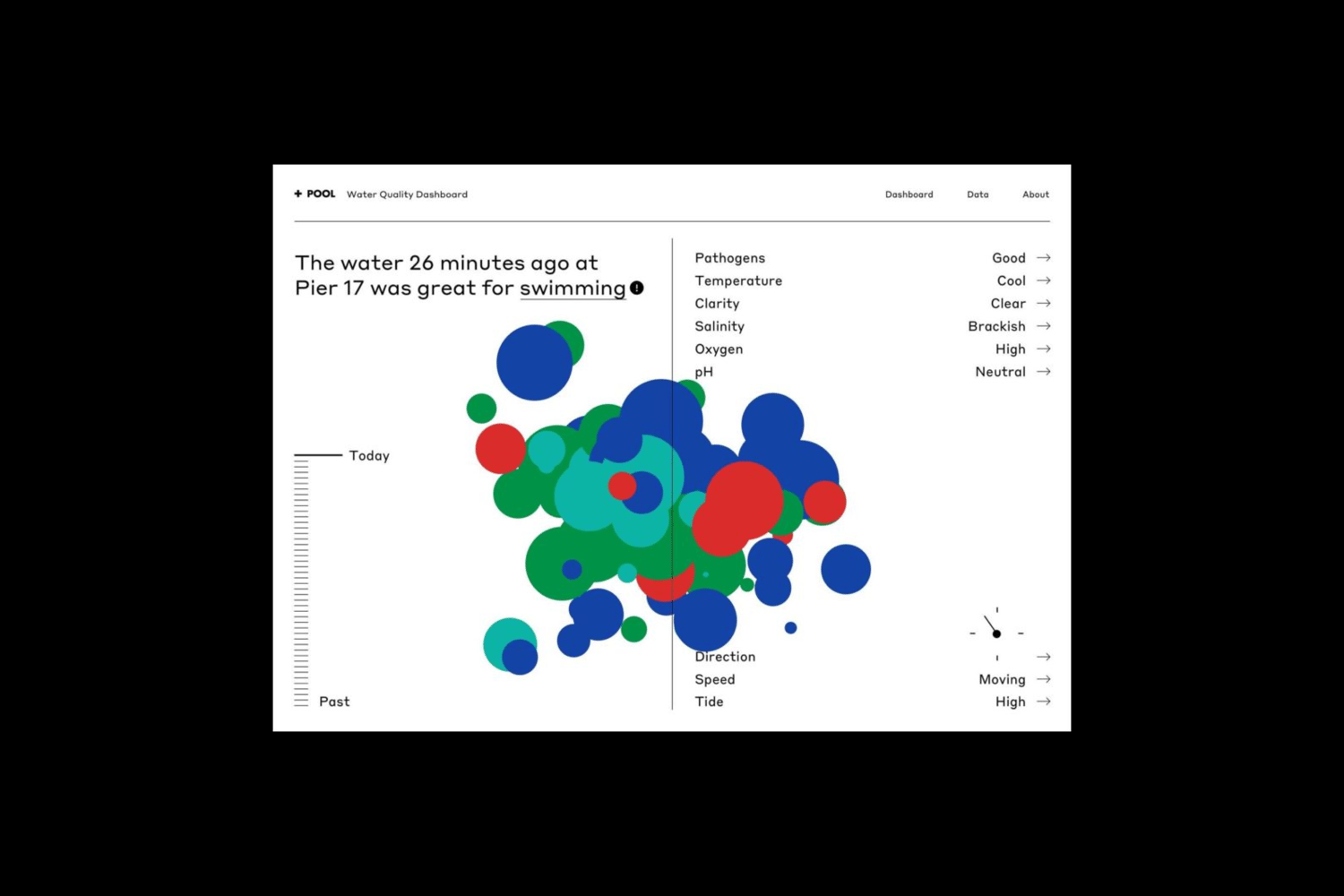 The + POOL dashboard differs from traditional data collection methods in that it draws on several points of live data – from river water to rainfall inputs – to then feed an algorithm that provides the public with near real-time reports on water quality. Updating with fresh data every 6 to 15 minutes, the + POOL dashboard predicts bacteria levels and thereby cuts the average time lag in water quality reporting by nearly 24 hours.